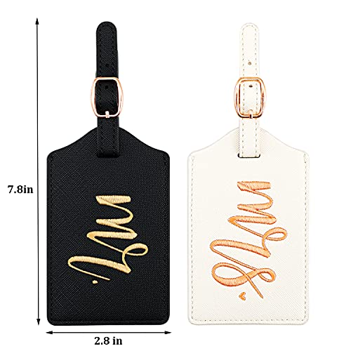 DURABLE & STRUDY DESIGN – Our mr and mrs luggage tags are made from high-quality PU leather. Solf, slim, durable and lightweight. It will not scratch your luggage case. The luggage tags can be bent, squeezed knocked around without getting damaged. These cute luggage tags are suitable for many long distance trips.PRIVACY PROTECTION – Easy to open up for writing in personal information on the inside paper name card or inserting your business card for easy identification of your luggage. The privacy shield provides ample security for hiding your contact information. You personal information won’t be hung out there for all the world to see, but is hidden by the flap. If your luggage is lost and the airline needs to see your information, it’s easy to do so without removing the tag.CUTE MR AND MRS GIFTS – You will get 2 cute luggage tags. 1 black luggage tag with embroidered “Mr.” in color gold, 1 white luggage tag with embroidered “Mrs.” in color rose gold. The bright color and size will help your suitcases be more easily recognizable at baggage claim. WIDE USAGE & PERFECT GIFTS – The travel tags for luggage are suitable for many different uses. Ideal for bridal shower gifts, honeymoon gifts, wedding gifts, bride gifts, bachelorette gifts, bridesmaid gifts for wedding day for women/men when they travel by plane, bus and train. It is also a perfect gift for Family Vacations, Valentine’s Day, Mother or Father’s Day and even business traveling parties.
