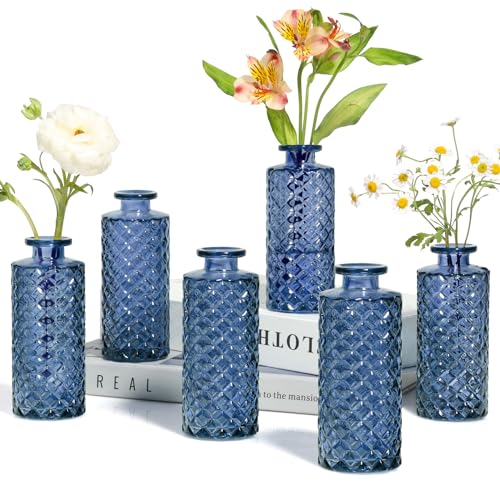 ComSaf Glass Bud Vases Set of 6, Small Diamond Bud Vases in Bulk, Mini Flowers Vases for Centerpieces, Vintage Decor Centerpiece for Table, Wedding Recepetion, Home, Housewarming Gift (Grey Blue)