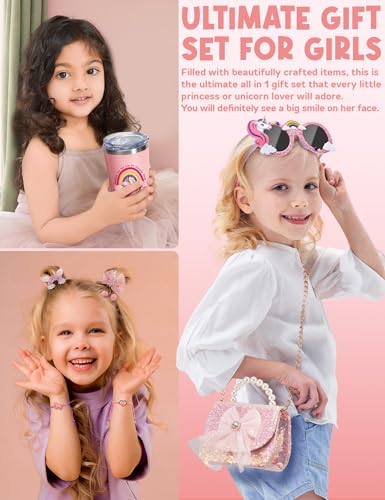 8 SURPRISE GIFT IN 1 BOX: Trabuono Unicorn Gift is perfect for 3-12 year old toddler/teen girls, gift for daughter granddaughter niece, including 12 oz cup, princess crossbody handbag, jewelry box, 5 hairpins, 2 bracelets, sunglasses, keychain, cat-shaped comb, 8 task tags, star ribbons & gift card in a big gift box. That contains all carefully designed toddler or teen girl gifts trendy stuff to surprise your girls. WARNING: CHOKING HAZARD- Small parts. Recommended Age Grading: 3+ years old.